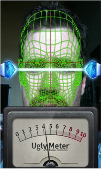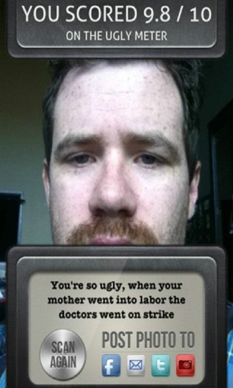 丑脸评分安卓版移植于iPhone平台,完美移植版本.Ugly Meter丑脸评分”是通过摄像头扫描人脸来实现评分的,操作起来十分简单。当进入到“Ugly Meter丑脸评分”的界面后,只要点击左下角的男性头像或和右下角的女性头像,就会进入到软件的头像扫描界面。我们既可以通过前置摄像头给自己拍照,也 可以帮朋友测试,在按下快门之后,软件便会对头像进行分析和评定,稍后给出评分和评语。