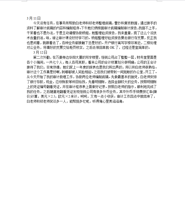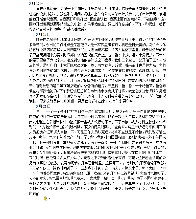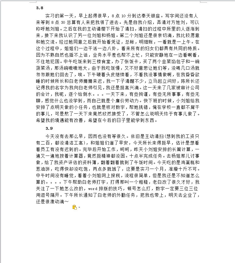 今天没有去那么早,因而也没有等很久。依旧是主动清扫(想到我的工资只有二百,都没清洁工高,和姐姐们道了早安,今天所长来得挺早,估计是想看看员工有没有迟到的。完毕后开始工作,呵呵,昨天小刘姐安排的长篇计算,一遍又一遍地按着计算器,竟然挺精神都没困。十点半完成任务。去杨姐那儿讨事做,给了我资产评估的资料簿,翻着翻着就到了午饭时间。今天吃的是鸡蛋糕和葱油饼,吃得快却没吃饱,两点多就饿了,这要是实习一个月,准瘦十斤不可。中午时间没有睡觉,看着小刘姐网上报税,流程很简单,但是我还是不知道怎么算的。。。。下午帮助白老师打字,打得那叫一个粗糙,老白改了很久才好,我关注了一下她怎么改的,word排版的技巧,顿号怎么打,数字一定要三位三位用逗号隔开。下午所长通知了白老师的外勤任务,把我也带上,明天去企业了,还是很激动滴~