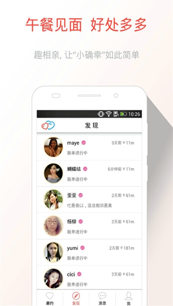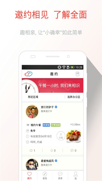 趣约会,我们单身人的圈子结合韩国的午餐约会文化,通过中午约异性饭友,为都市单身男女创造轻松、有趣、便捷的交友场景。