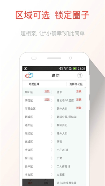 3.邀约区域可选:大中城市中不同的区域聚集着不同类型的单位,邀约区域可选,有助于用户锁定特定圈子的单身人士。