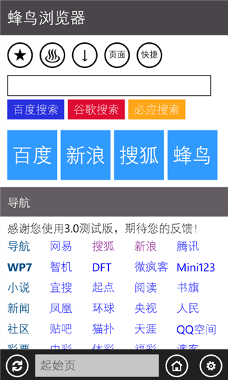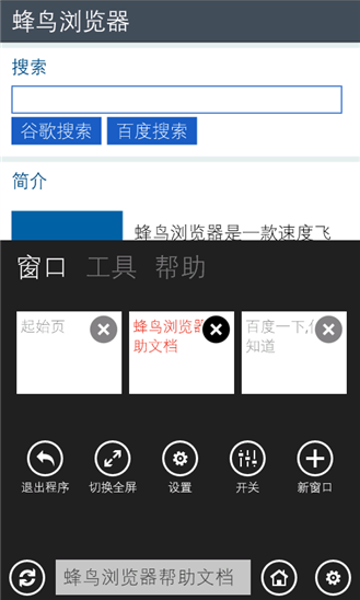 蜂鸟浏览器是wp平台上的一款简单小巧快捷的浏览器工具,你可以通过它顺畅地浏览网上的各种信息。如果你觉得自己现在的浏览器不太好用,那么不妨来试试这款。