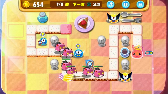 游戏的玩法小编不用做详细的介绍了,玩过塔防游戏的朋友们看到这个画面自然明白,玩家们只需要通过点击建造并不断的升级我们的防御塔就行了。当然,在关卡的空隙中,玩家还可以清扫地图中的障碍,不仅可以收获一定的金币来扩充自己的经济,而且还有一定几率打出伙伴,助阵玩家顺利通关。