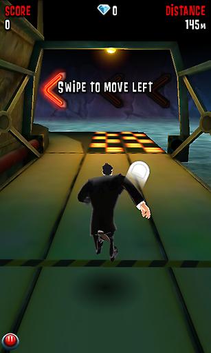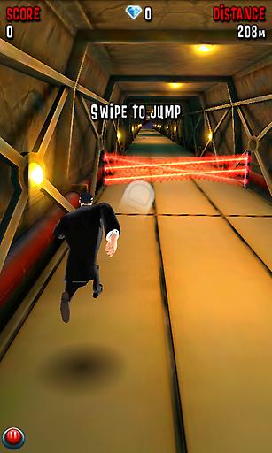 是一款跑酷类游戏,整体设计和神庙逃亡相似,玩家通过触屏来操控特工到处奔跑,同时游戏还提供武器。 在游戏中我们将扮演一名特工,在接到上级的指令后需要完成一系列任务,在完成任务的过程中需要我们不停的奔跑、躲避障碍和射击。有四名特工可以选择,分别 是男主角特工达史、女主角特工乔安娜、男一号特工颚骨和男二号特工博巴乔布。男主角特工达史我们可以直接选择,后三名特工需要我们在游戏的过程中积累钻石 去解锁。另外,男女主角各有三套帅气的衣服可以更换,其中有阿凡达、猫女、侍应生、复古风、间谍等多种电影元素。