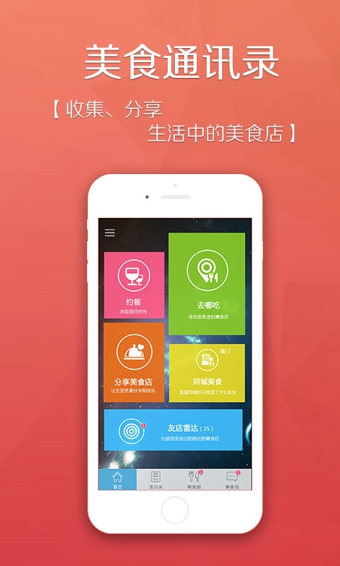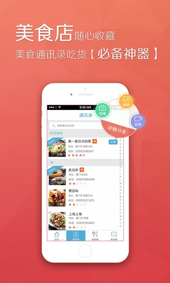 走到哪里吃到哪里,这还不算真正的吃货。能够做到走到哪里就能把哪里的真正好吃的美食找到,吃到那才叫吃货。美食通讯录就可以做到哦!不仅能吃到好吃的还能结识跟你一样爱吃的吃货朋友!美食通讯录:一款美食社交类APP,吃货必备神器,可以把靠谱的美食店收藏或分享在朋友间口口相传,和小伙伴分享美食的点点滴滴,约餐,就是这么简单。