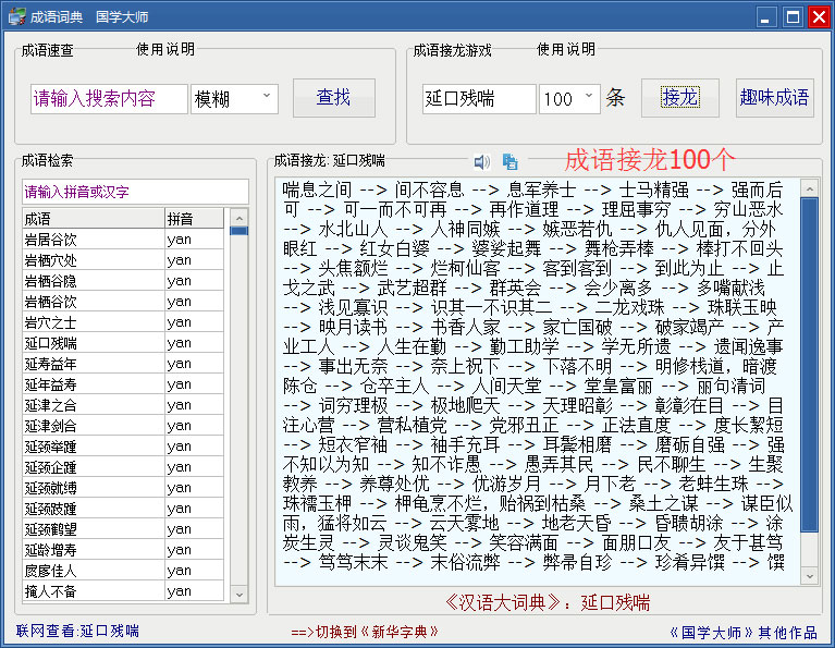 新华字典+成语词典为《国学大师》系列之一。《新华字典》收录了GBK全部汉字20924个。可离线查询汉字的拼音、部首、五笔、笔画、笔顺、详细解释、例句、用法等。提供多种检索方式,可按拼音索引,也可按部首、总笔画、五笔、笔顺检字;还提供了6000多个常用汉字的笔顺动画演示,是中小学生学习汉字的良好工具,可帮助初学者按正确地笔画顺序书写汉字。《成语词典》共收录汉语成语56620条;成语中包含有拼音、解释、出处、示例、近义词、反义词、语法 、成语故事等解释内容。检索方便,支持拼音或汉字检索;支持模糊、精确、词首、词尾查找成语;还提供成语接龙游戏。