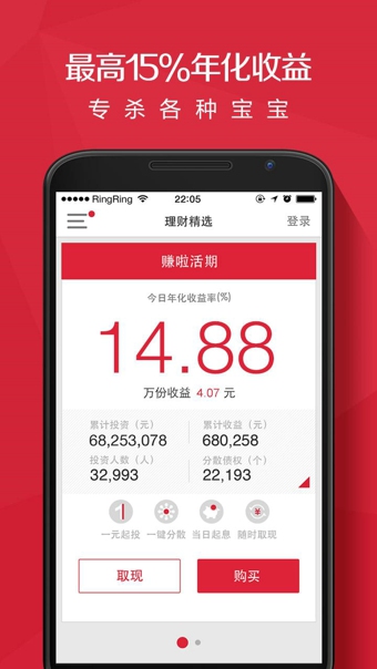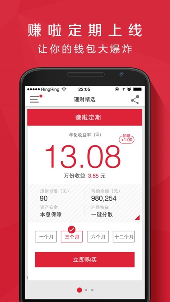 史上最会赚钱的理财神器!年化最高15%,高于银行35倍利息!极速起息,节假日也享收益!还在记账省钱?快来赚啦理财赚钱!各大市场好评如潮,千万用户共同选择,15%年化收益率的余额宝,就是赚啦理财!