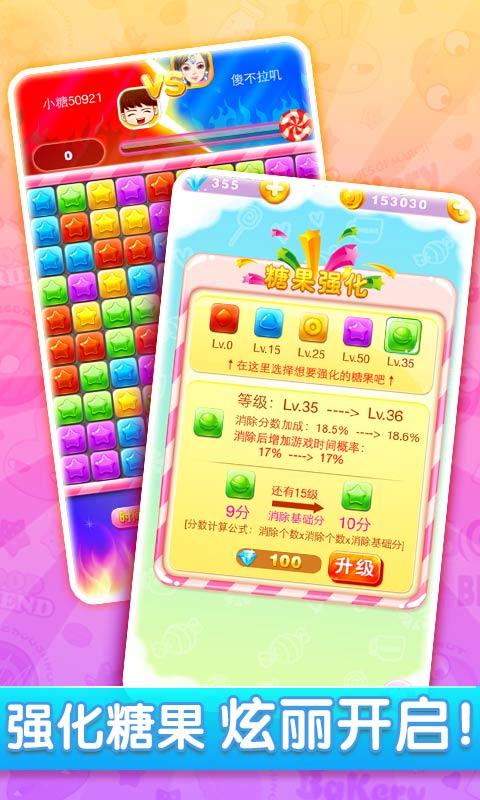 全面超越消灭星星之作!全新糖果换装待发,清凉一夏欢乐有你!只要点击两个或更多相同的糖果就可以消除,玩法简单容易上手!首创糖果强化功能,全新属性给你好看!通过强化还能获得更多更好玩的糖果造型,想怎么搭就怎么搭!超级任务2000钻,马上等你来挑战!全新内容给你全新体验,赶快来HIGH吧!【游戏特点】