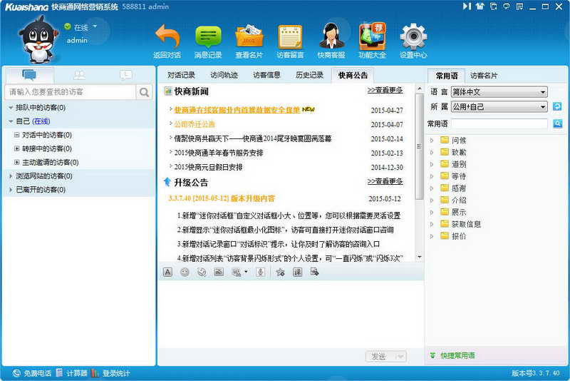 快商通网络营销应用系统是一款互联网在线营销系统,为企业解决网站与访客实现沟通的即时营销工具。它可以像监控器一样对网站的访客进行实时监控,知道访客的来源地址、搜索关键词、正在访问哪个页面,广告投放一目了然;可对正在访问网站的访客发起对话,化被动为主动,让您的网址开口说话;可实现电脑与手机进行同步咨询---电脑能接待手机访客,手机也能接待电脑访客,同步保存记录,真正实现移动互联网营销。【软件特点】