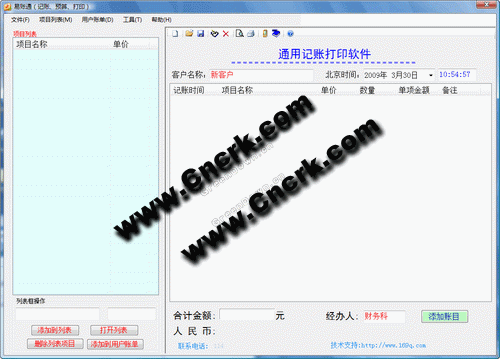 易账通 V2.10 简体中文绿色免费版 易账通(通用记账打印软件),主要适用于需要管理账目和打印票据的商店、超市、饭店、小型企业、医院,重视资产管理的个人和家庭。软件可进行收支记账、收支预算、查看账目信息、保存账单、打印账单、打印收款收据等功能, 具有单项金额、累计金额自动计算和人民币大写自动转换功能;可以使用打印预览查看输出结果。特别适合于不会打字的初学者同样可以轻松操作。