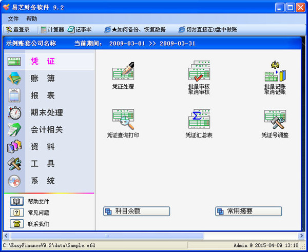 易芝财务软件下载 v9.2 免费版 凭证编辑、打印、汇总、查找,总分类帐,明细帐,数量金额帐,辅助核算表,日记帐,试算平衡表,科目余额表,利润表,资产负债表,现金流量表,自定义报表,资产折旧计算等。