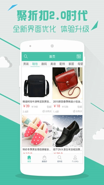 聚折扣每天都有万种折扣商品上线,集优惠于一身。目前品类涵盖男装、鞋子、包包、个人用品等,应有尽有,为用户提供商品浏览、购买、分享等功能,商品同时支持正品保障、极速退款、7天无条件退换、赠运费险等特权,为用户提供方便快捷的手机购物体验。