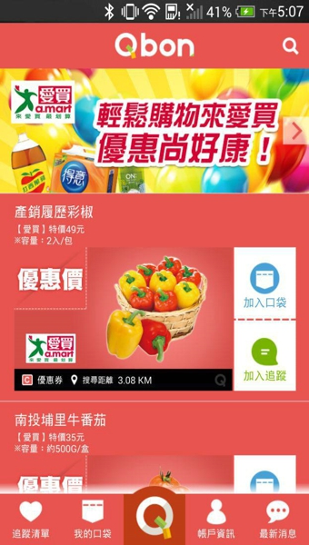 Qbon搜集全台食衣住行育乐各类优惠票券与好康,随时开启优惠墙,浏览附近包括全家便利商店、吉野家、田季发爷、美联社等众多好康,随地随取即用,还有机会在使用App 时达到各种里程碑而获得奖励优惠,让App 不只是App,更是随身优惠接收机,任何好康优惠都逃不出你的手掌心~吸睛特色:精确提供:可以判断你的位置,并提供离你最近的优惠,让你领到最实用的优惠券!丰富店家:多家知名连锁店家提供Qbon独家优惠,丰富度让你目不惜假!立即领取:看准喜爱的优惠,一个点击步骤就可以轻松收入口袋!点击兑换:使用最易上手的兑换方式,让你使用APP不需额外学习破解任务:完成有趣的小任务,你的优惠就比别人丰富唷!即领即用的特性,让你走到哪省到哪,使用随身口袋Qbon,一起当聪明消费达人!
