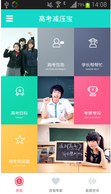 高考减压宝的功能有以下几种:1、心理测试:丰富的测试分类,包括了情感、性格、压力、趣味、能力、财富等,全方位关心您。通过专业开发的压力测试,您可自测目前所处状态,从而选择合适的减压音频或减压方式。