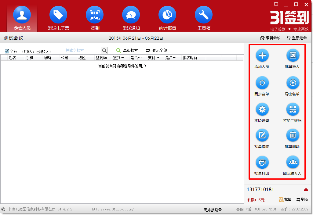 31签到软件可以实现会议现场的电子签到、短信通知、统计分析等基本需要。使用者只要具备网络、电脑即可轻松实现高效、准确的签到流程,同时即时掌控现场 参会者数据。实现高效、专业、科技会务。31签到软件完全免费。【软件特点】
