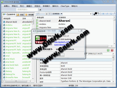 字体试衣间适用于电脑中流行使用的所有字体,包括True Type字体(*.ttf, *.ttc),Open Type字体(*.ttf, *.ttc,*.otf),PostScript Type 1字体(*.pfm,*.pfb),以及微软的Windows字体(*.fnt, *.fon)。 独有的Character Map特性,无需安装字体也能查看它的所有字符,并以和主界面相同的色彩及模式显示,可以点击放大。当鼠标悬停在某个字符上,一个小小的提示框会告诉你它的Unicode编码、编码说明(Windows XP下)和小键盘输入的ALT+数字按键。通过查看字体属性,可以知道字体在不同语言区域所采用的字体名、版权、版本、商标、制造商及URL地址等信息。通过字体试衣间对每个字体有了通透的了解后,可在程序中选择一或多个字体,直接批量安装和卸载。字体试衣间对系统缺省字体,已安装和未安装的字体使用不同的颜色显示,管理起来非常直观方便。 字体试衣间中还加入了LCD液晶显示器的ClearType字体平滑调整功能,更加方便了使用。
