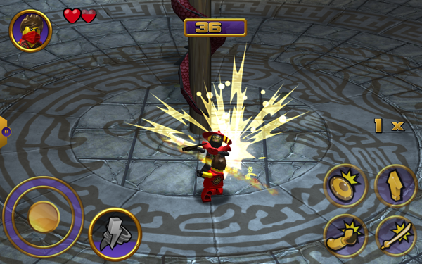 乐高幻影忍者游戏操作简答通过摇动左下角的虚拟摇杆控制角色上下左右操作,而右下方有跳跃、格挡、投技和攻击四种操作。当能量槽满了,玩家便可以点击虚拟摇杆左方的技能按键发动必杀技能。这种操作常应用于动作类游戏,相信玩过这类型游戏的玩家不会感到陌生。每击杀一个敌人的时候,会掉落一定数量的齿轮和随机掉落恢复血量的红心道具。当血量为零的时候,游戏就要结束了。小编在这里给大家一个提示:敌人的攻击是有先后顺序的,不要因为一大堆人包围上来而惊慌失措。战斗的时候细心就会发现,当敌人有进攻的举动之前,身体会被红光包围着身体并维持大概2秒的时间,玩家可以优先选择攻击发光的敌人打断他的进攻动作。
