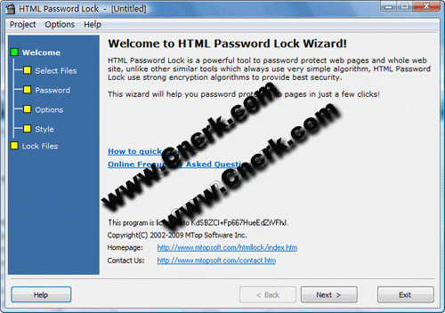 HTML Password Lock v5.4 英文绿色特别版 网页加密软件是一个对网页文件加密的软件,不同于一般的网页加密软件,它是通过验证用户输入的密码来决定是否能打开网页,可以给单个网页或整个网站加密,加密的种类可以是只对单个授权用户开放或对特定的多个授权用户开放。只有输入正确密码的用户才能访问加密后的文件且加密后的文件不依赖任何外部支持程序就可单独运行。你不需要学习任何复杂的编程语言,也不需要学习复杂的算法知识,使用程序自带的向导只需简单的四个步骤就可以完成整个加密过程。已经汉化主程序及自带的用户登陆网页模板文件.