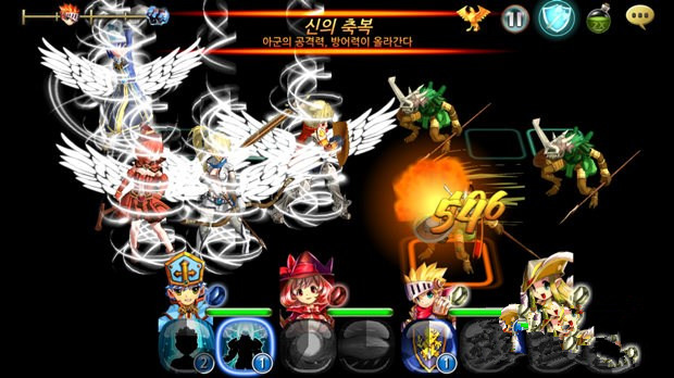 本作的战斗功能可谓简单又酷炫,画面下方是小队成员的状态和技能,每名队员有2个技能,技能图标右下角的数字表示可施放次数,当冷却 CD 完一圈后就会增加一次。玩家可以选择手动来点击施放或者全程开启自动战斗功能,两种方法都有不一样的快感。另外值得一提的是,除了技能拥有绚丽的效果之外,部分技能在施放时还会有分屏动画特写,简直高大上。