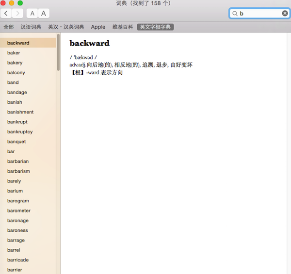 英文字根字典mac版以字源(包括字首、字尾、字根)为中心部析英文单词的结构,方法新颖独特,内容翔实丰富。英文字根字典mac版能帮助用户轻松易记,情趣盎然;诀窍在握,事半功倍。您的英文词汇准能迅速剧增。