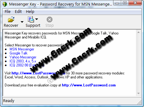 Messenger Key 这个程序为了 Mirabilis ICQ UINs 恢复口令。软件允许你到拖放 ICQ 数据库文件到恢复口令的程序窗口。所有开始于 ICQ 99 的 Mirabilis ICQ 的版本被支持
