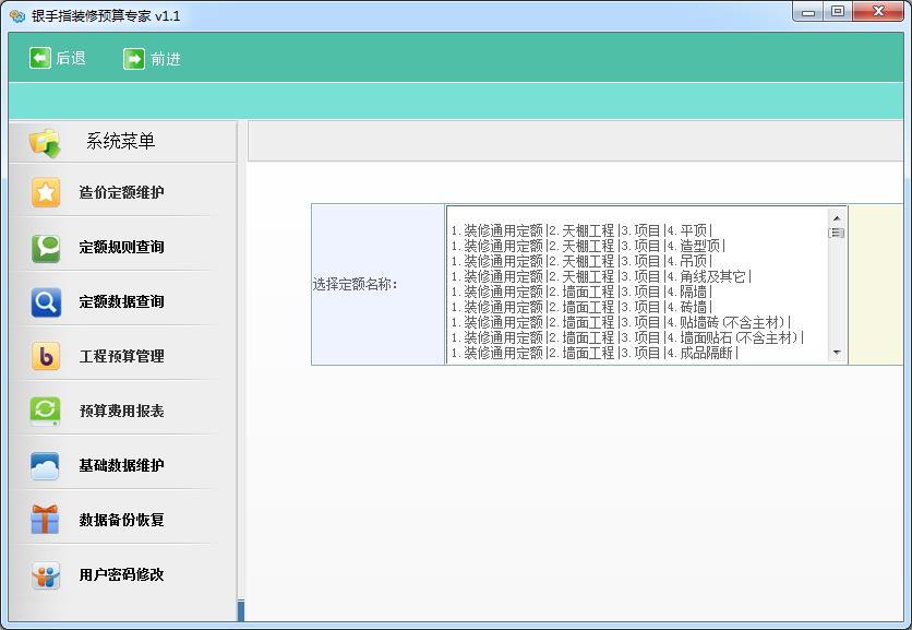 银手指装修预算专家软件具有功能强大,适应性强,运行可靠,管理方便,操作简单,充分保障数据安全等特点。银手指装修预算专家软件一直是装修预算工作的短板,本软件能及时的反映出装修工程造价的实时变化,这些变化包括材料价格的变化,工程预算费用的变化,费用预算方式的变化,计税方式的变化,所有这些变化都能及时的体现在预算软件中,原因很简单,本软件采用定制而成,能最大化的适应实际工作的变化。【软件说明】