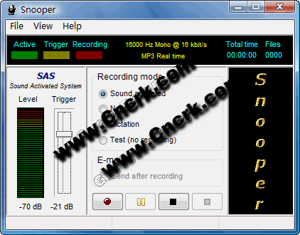 Snooper是一款电脑实时录音软件,软件使用了先进快速的mp3技术,录制一小时只需要不到4mb的空间,还可以自动通过电子邮件来发送完成的录音,功能繁多。
