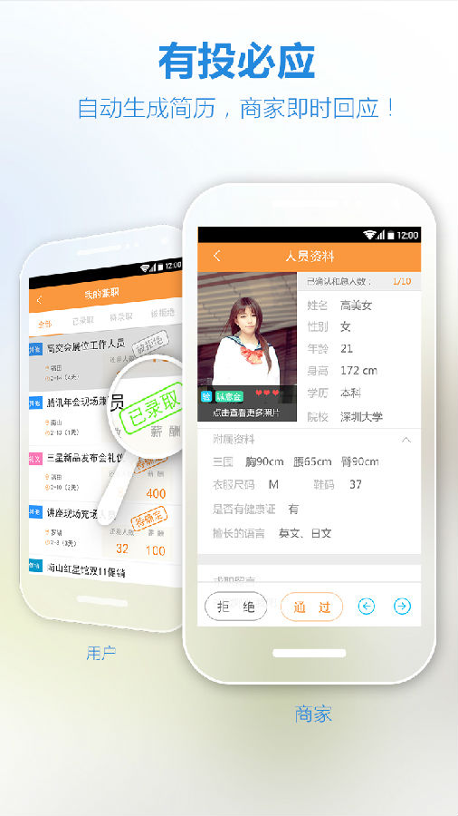 「及时回复」简历通过与否,系统都将在第一时间告知您,绝不错过任何一个机会;