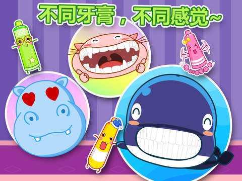 小猫的牙齿变黄了,小河马的牙缝里有牙垢,小鲸鱼的牙齿上还有残留的食物……快用小小牙刷帮它们刷刷牙吧!