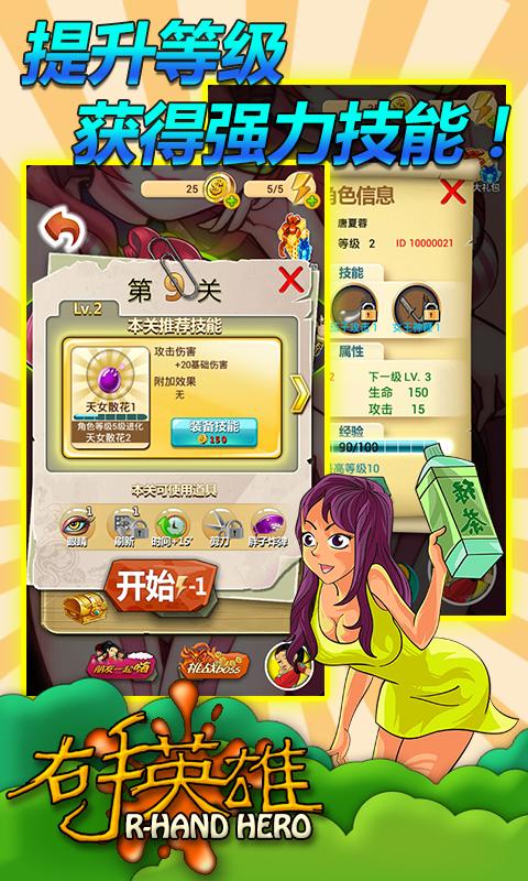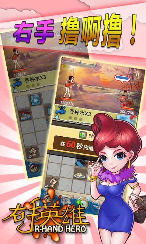 右手英雄(right_hand_hero)是卓望信息技术(北京)有限公司开发的一款休闲益智类游戏。史上首款无厘头恶搞游戏,属于你的右手之旅行。捧腹的招式,炫目的技能,决对新鲜的体验!不管挑战者是70后、80后、90后还是00后,在高智商的题目面前,谁才能一撸到底?网罗时下最劲爆的段子,宅男腐女贴身必备。一种新奇、诙谐的战斗方式,让你在猜图中体验最爽快的冒险历程。形形色色幻化成人形的妖怪,各种趣味盎然的场景。还等什么,让我们一起来比比,看谁被恶搞?
