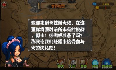 击开始游戏进入,界面右下方为菜单,点击世界地图中的关卡进入战斗画面;点击左下方的按钮控制角色移动;点击右下方的按钮控制角色普通攻击和技能使用;点击左方的武器即可切换不同的武器;界面左上方显示角色血量和状态!此外还有华丽的技能特效,风格迥异的关卡内容,激烈的战斗场景会让你热血沸腾!