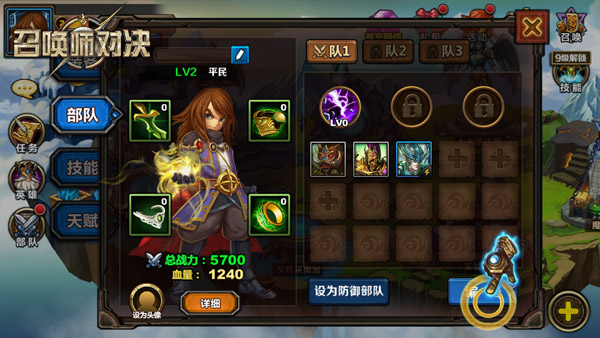 《召唤对对决》的卡牌部队,由玩家担任的召唤师,和卡牌英雄组成。召唤师相当于部队中的主帅,统领英雄进行战斗。召唤师还能携带装备、技能天赋,从而高效提升部队整体战斗力。