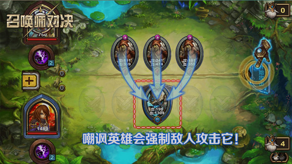 《召唤师对决》英雄因种族、职业、技能的不同,能组合出多种流派打法,如法术流、菜刀流等。对于刚接触《召唤师对决》的玩家来说,采用攻守兼备的战斗方式比较保险。玩家可先打出一张有【嘲讽】技能的英雄,强制对方英雄攻击它,吸引火力。然后再打出一张高输出英雄猛攻对手,并配合召唤师技,压制全场。等到下一回合可再派出法术群攻英雄,对敌人持续大面积打击,扩大己方优势。