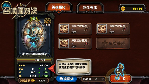 强化是提升英雄其技能、生命、战斗力的最直接方法。英雄强化有两种方式:吞噬英雄、粉尘升级。当玩家有了无用的灰卡、绿卡、经验卡可直接喂给高品质英雄。如果是无用的蓝色以上英雄,则需现在神庙将其分解成粉尘,才能用来强化。分解除了粉尘还能获得其他珍贵材料,可用来兑换英雄。