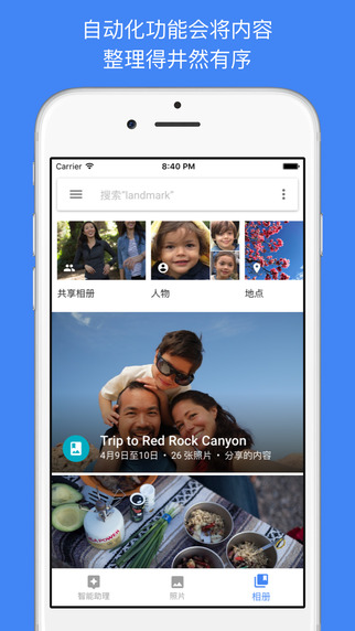 Google 相册可供您存放所有的照片和视频,并让您根据地点和重要的事物来搜索和整理这些内容。? 可视化搜索:您现在可以根据照片中的地点和事物来搜索照片。想要寻找您在夏威夷吃过的墨西哥鱼肉卷饼吗?即使没有相关描述,您只需搜索“夏威夷”或“食物”即可找到。