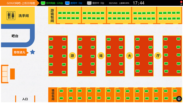 GOGO网吧上机引导图对大型高端网吧、网咖设计,大型网吧、网咖往往面积大,场地情况复杂,顾客开卡后找机不方便,特别是在网吧上网高峰期,不知道哪里有空机,有的顾客要双人连座的,使用GOGO网吧上机引导图能使顾客能够快速了解网吧机器布局及使用情况。