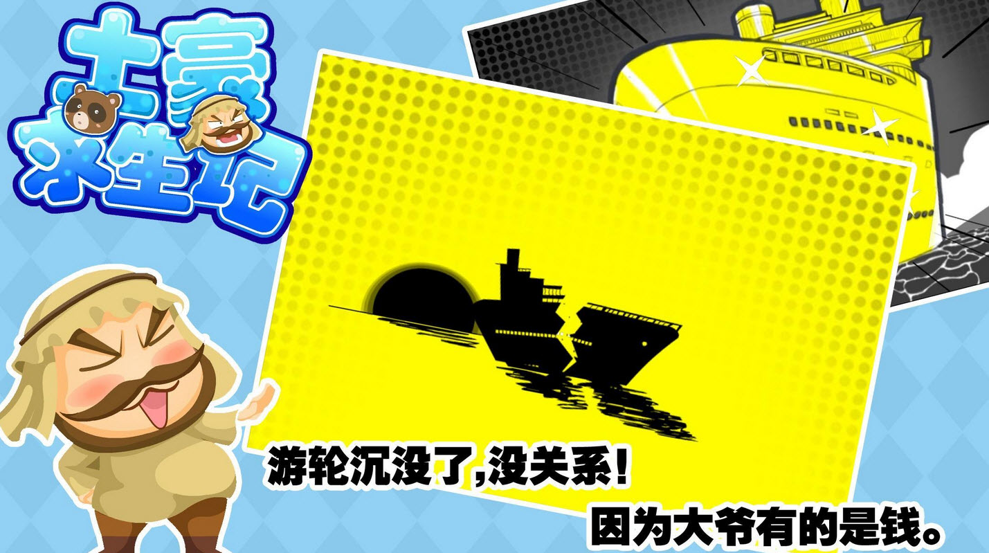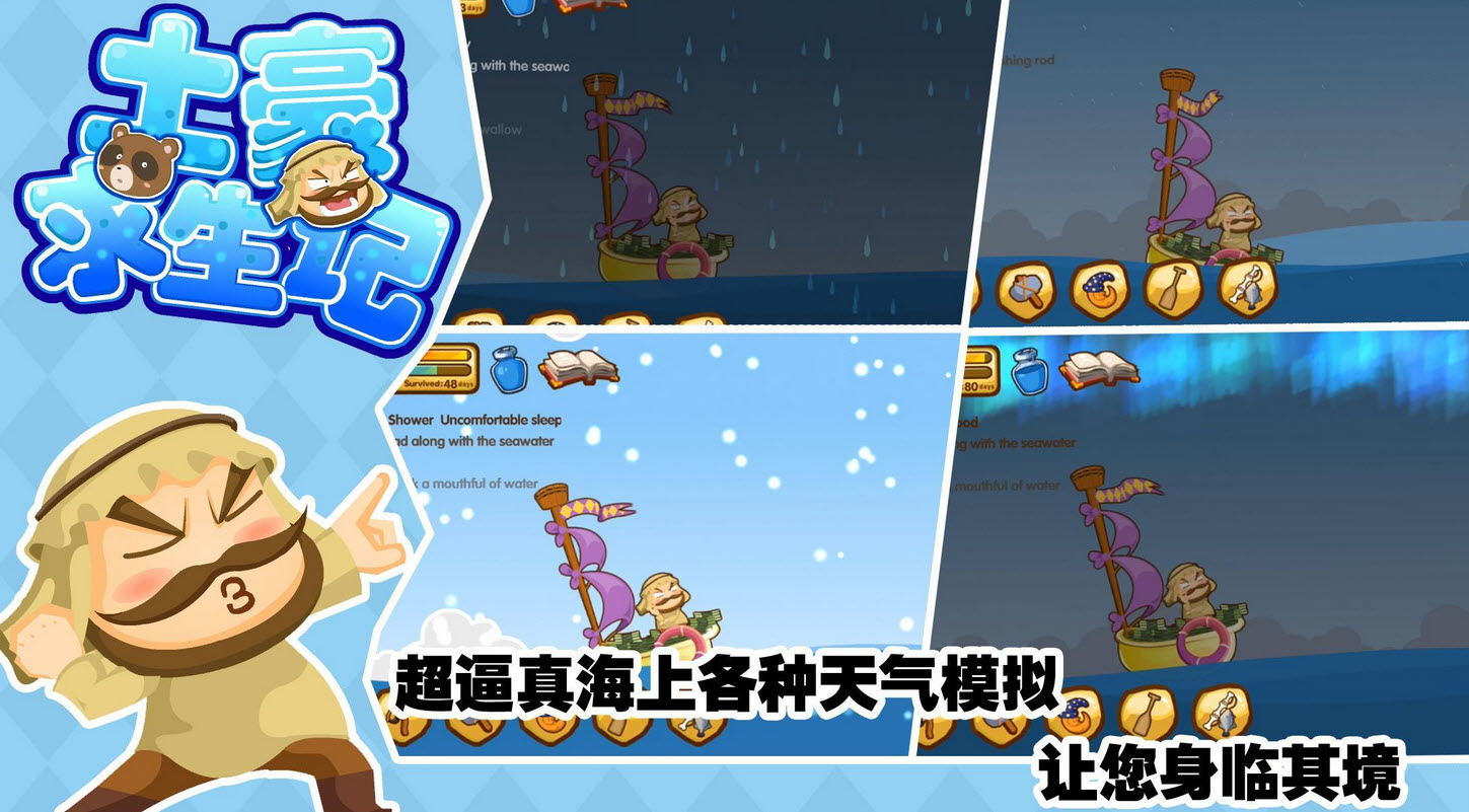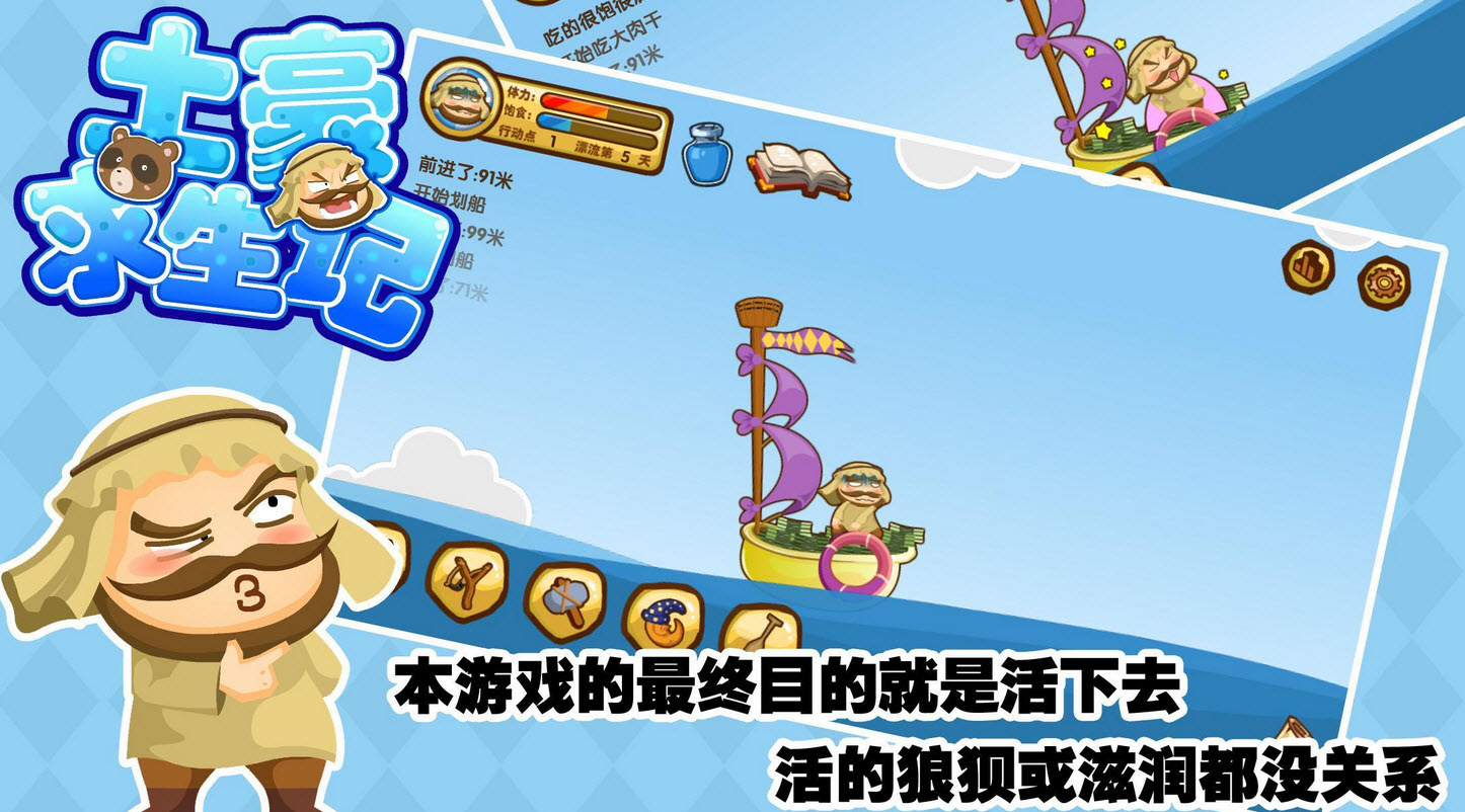 土豪求生记RichManSurvival是一款非常有创意的休闲娱乐类游戏。游戏中土豪乘坐他的私人豪华游轮出海旅行,航行中游轮不幸沉没。在游轮即将沉没时,他机智地用浴缸当作救生艇装满了钱和钻石逃了出来。现在,你需要利用有限的工具,帮助土豪在到达最近的岛屿之前活下去,你可以制作船桨、捕捉海鸟、提炼淡水、钓鱼等等,还要合理安排土豪的饮食,让他保持健康的身体和旺盛的精力。【软件特点】