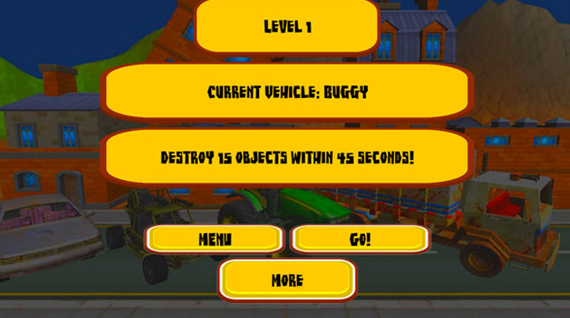 《破坏小镇2 Crash It Smash It 2》是一款发泄类的休闲小游戏。游戏中你将驾驶着越野车疯狂的冲撞小镇,对小镇进行破坏。并且,每过一关你需要破坏的建筑数量就会增加。表示在心情很糟的时候玩耍会非常解气!