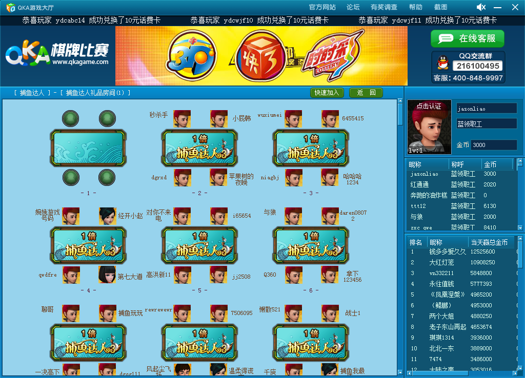 QKA捕鱼达人3是是一款,中国返奖率最高,不充值也能赚奖品的捕鱼游戏。《捕鱼达人3》以深海狩猎为题材的街机游戏,游戏场景采用全3D制作,以深海作为QKA捕鱼达人3游戏背景。2010年中顺公司出品网络版《捕鱼达人3》,运营商为吉林省中顺网络科技有限公司。【qka捕鱼达人游戏玩法】