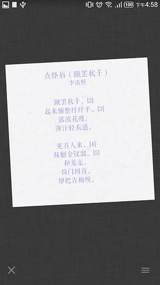 诗Shi安卓版是一款免费的诗词平仄格律检测应用,这款软件能够自动检查平仄、辅助写诗的App。选择相应格律后,即可以开始优雅流畅的填写。在写词过程中,除了会高亮出平仄不对的汉字外,还可以方便地查找同韵字;除此之外,诗Shi还支持更换词笺纸背景,使您的习作完成后更加完美。【软件特点】