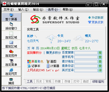 该抓图软件注于屏幕抓图,体积小巧,虽然安装包只有2M大小,完全满足抓图的不同需要,功能包括全屏抓图、抓整个活动窗口、抓自定义区域、抓固定区域(可以精确定位)、抓选定控件和抓某个菜单界面,能够让您得心应手地捕捉到需要的屏幕截图。