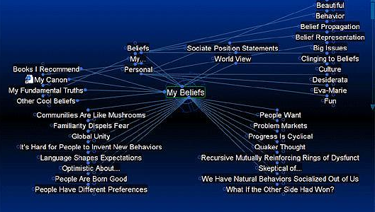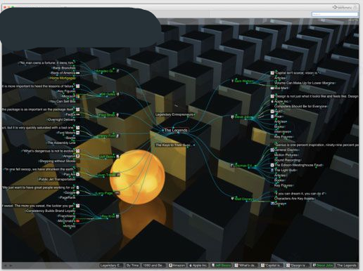 在发展的初期,网络思维导图的应用程序非常原始,主题相关的连线非常粗糙且不支持如项目管理和演示这样的高级功能。现在,HTML5技术的发展产生了许多快速优雅的应用程序。比如,动态思维导图软件Thebrain。这是一款三维立体式的思维导图工具,在导图呈现的方式上摆脱了传统平面方式的局限,同时它支持所有流行的在线服务,上面的每个节点都可与相关网络资源相连,在使用者眼里它就如同一个大脑一样。所有的访问都可以通过点击或者输入简单字符来快速完成。