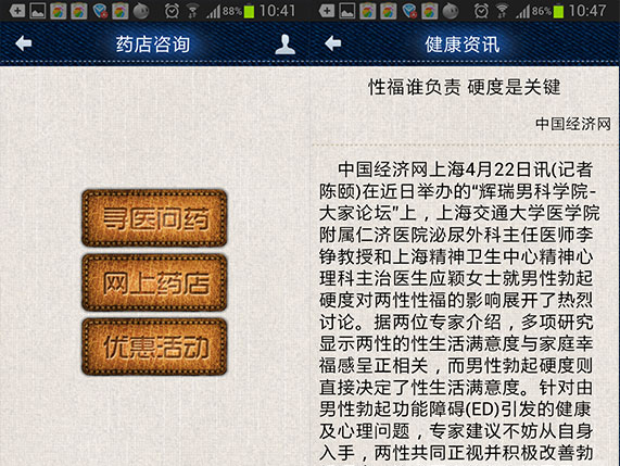 3、全国连锁网上药店查询及咨询电话链接(全国数十家网上药店介绍,药品信息及最新活动展示等功能,同时提供一键呼出功能,可以向网上药店进行电话咨询),最终有利于男性疾病患者用药安全和大众健康。