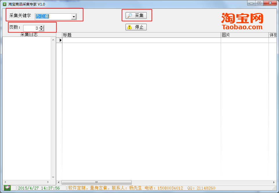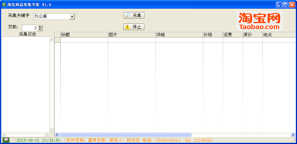 淘宝商品采集专家是一款可以快捷搜索淘宝网商品的软件,输入商品关键字就可以采集了,商品的名称,图片,介绍,价格,淘宝号等信息都可以显示出来。欢迎下载!