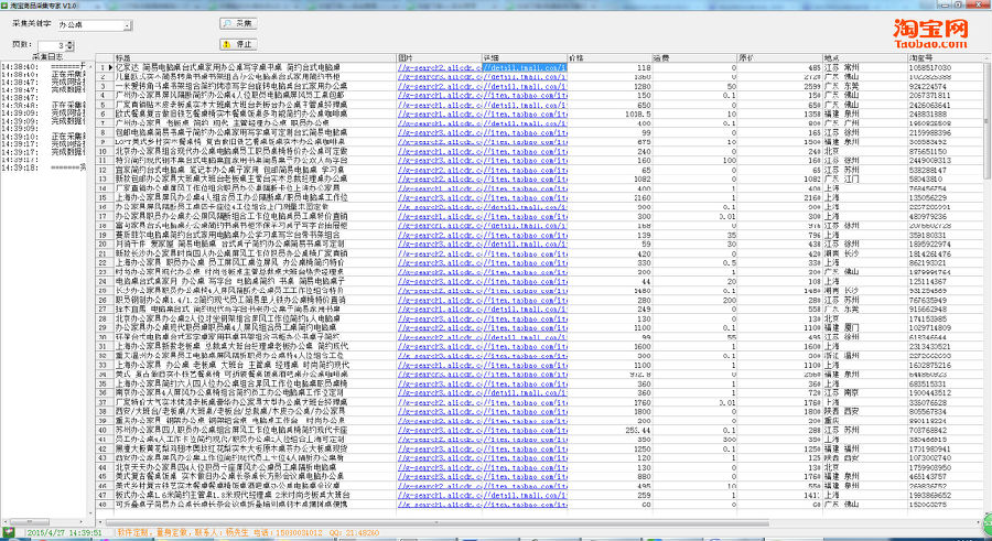 2、小编这里输入的是办公桌,前3页的采集结果就列举在这里了。