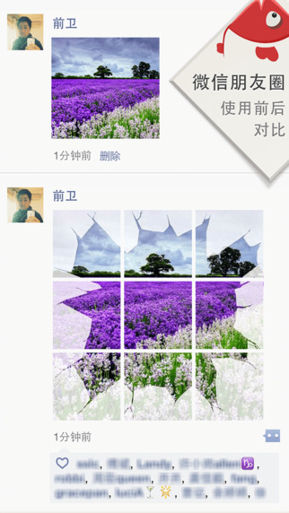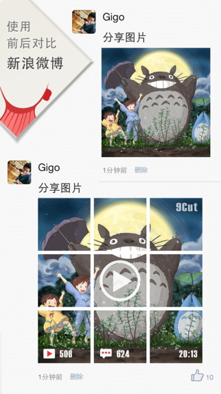 9cut app微信朋友圈、微博、QQ空间上最新奇的发图赚眼球利器,9cut app能帮助大家把1张大图切成9张小图,这样就能在微信朋友圈、新浪微博或QQ空间上上传这9张小图拼成1张9宫大图啦!还有多种外形让你选,实乃刷屏利器!9cut app微信朋友圈、新浪/腾讯微博、QQ空间... 任何支持9张图片3×3排列的地方都能用到它哦:)