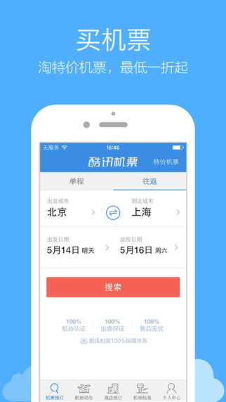 酷讯机票覆盖3000多条航线、上百家机票代理商网站,用户能够实时查询国内外各城市之间的最新航班价格信息,为用户提供最低价、最省钱的出行方案。低价、省钱是酷讯机票搜索最大的特色。此外,酷讯特价机票还为用户精心准备了机票价格往返趋势、特价机票预约、航班动态跟踪系统、机票服务保障联盟、机票预订往返打包等各种服务,让用户在线预订机票省时、省心更省钱。