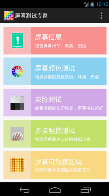 屏幕信息:屏幕可用区域分辨率大小,像素,密度,DPI值等。屏幕颜色测试:检测屏幕的颜色变现力,坏点,亮点一眼就能发现。