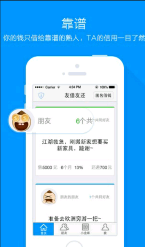 友借友还是首家服务于熟人间借贷的社交金融APP, 致力于打造年轻人想要的金融:真诚、接地气、有人味儿,让朋友间借钱顺畅又愉快,破除“谈钱就会伤感情,谈感情就会伤钱”的历史难题。友借友还是基于手机通讯录的一度二度人脉关系链的社交借贷产品,既具备社交属性,又具备金融属性。如果想要借款,用户需要注册并提交身份证照片审核,待审核身份证成功后就可以系统自动更新用户的学历,上传通讯录之后就可以向同样注册友借友还的好友借钱啦友借友还”致力于打造年轻人想要的金融:真诚、接地气、有人味儿,让朋友间借钱顺畅又愉快,谈钱也能谈感情。你能借到的不只是钱,更是朋友的理解与支持;帮助朋友收回的也不只是钱,除了13%的年化收益,更能赢得尊重与信赖。
