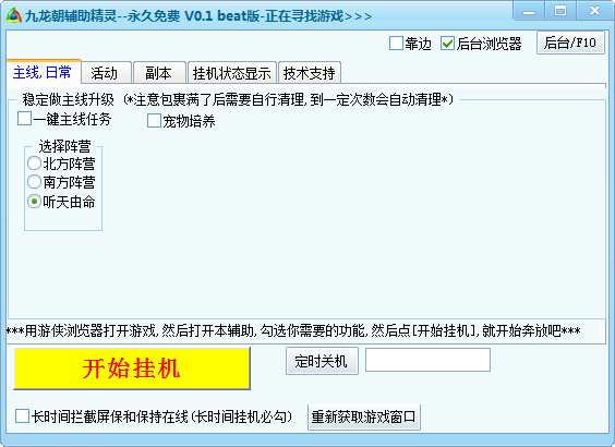 本辅助基于屏幕识图和按键模拟技术,请勿将游戏窗口最小化,请保持游戏窗口尽量大。如确实需要隐藏,可点击辅助右上角的“后台浏览器”按钮。