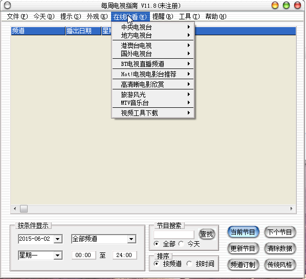 每周电视指南让你不错过任何精彩的电视节目,它利用了互联网的便捷性和数据库的强大查询功能,使你可以方便地下载最近两周的电视节目表并选定自己最喜欢看的内容。在线网络电视功能,让你不装卫星天线也能收看到最新港剧、台湾综艺,各大体育赛事。支持皮肤选择,界面更漂亮。《每周电视指南》也是迄今为止国内第一款可同时收看网络电视和查看电视节目表的软件。
